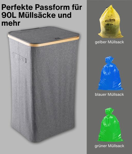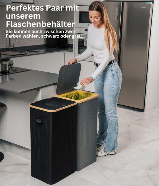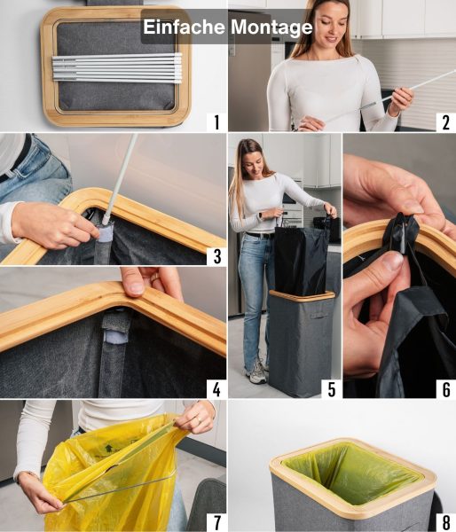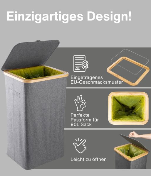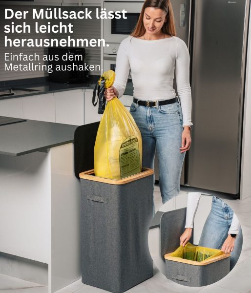 Dieses Modell zeichnet sich durch verstärkte Nähte, langlebige Materialien und eine ästhetisch anspruchsvolle graue Farbe aus, die sich nahtlos in jeden Raum einfügt – sei es ein modernes Büro oder eine minimalistische Küche. Sein kompaktes und dennoch geräumiges Design ermöglicht effizientes Recycling, ohne zu viel Platz zu beanspruchen. Darüber hinaus verfügt der Behälter über einen Bambusrahmen mit einem Eisenring, an dem der Müllbeutel befestigt ist, so dass er leicht ausgetauscht und verwendet werden kann. Der Mülleimer ist für 90-Liter-Müllsäcke ausgelegt, Sie können aber auch problemlos größere Säcke verwenden.