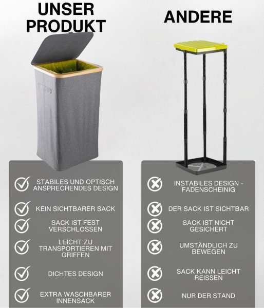 • INNOVATIVES DESIGN: Unser patentierter Bambusrahmen mit Metallring hält den Müllbeutel sicher an seinem Platz und verhindert, dass er durchhängt. Der Stoffdeckel verbirgt diskret die Abfälle und hilft, Gerüche fernzuhalten.