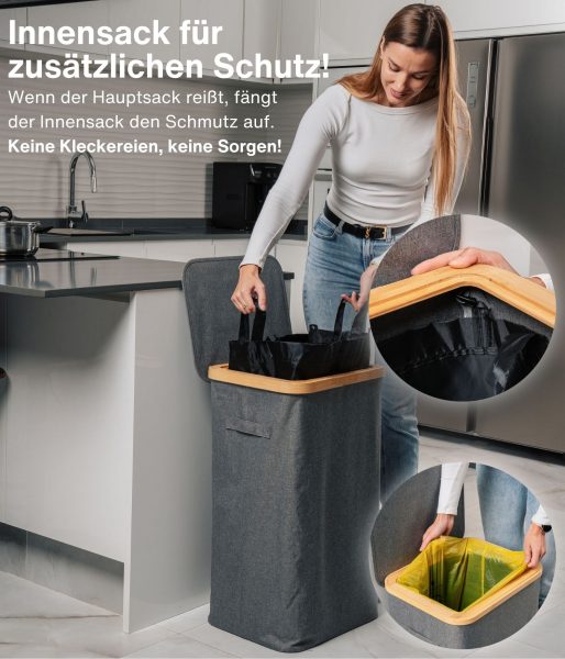 Ein zusätzlicher Innenbeutel dient als zusätzlicher Schutz vor Verschüttungen, falls der Müllbeutel reißt.