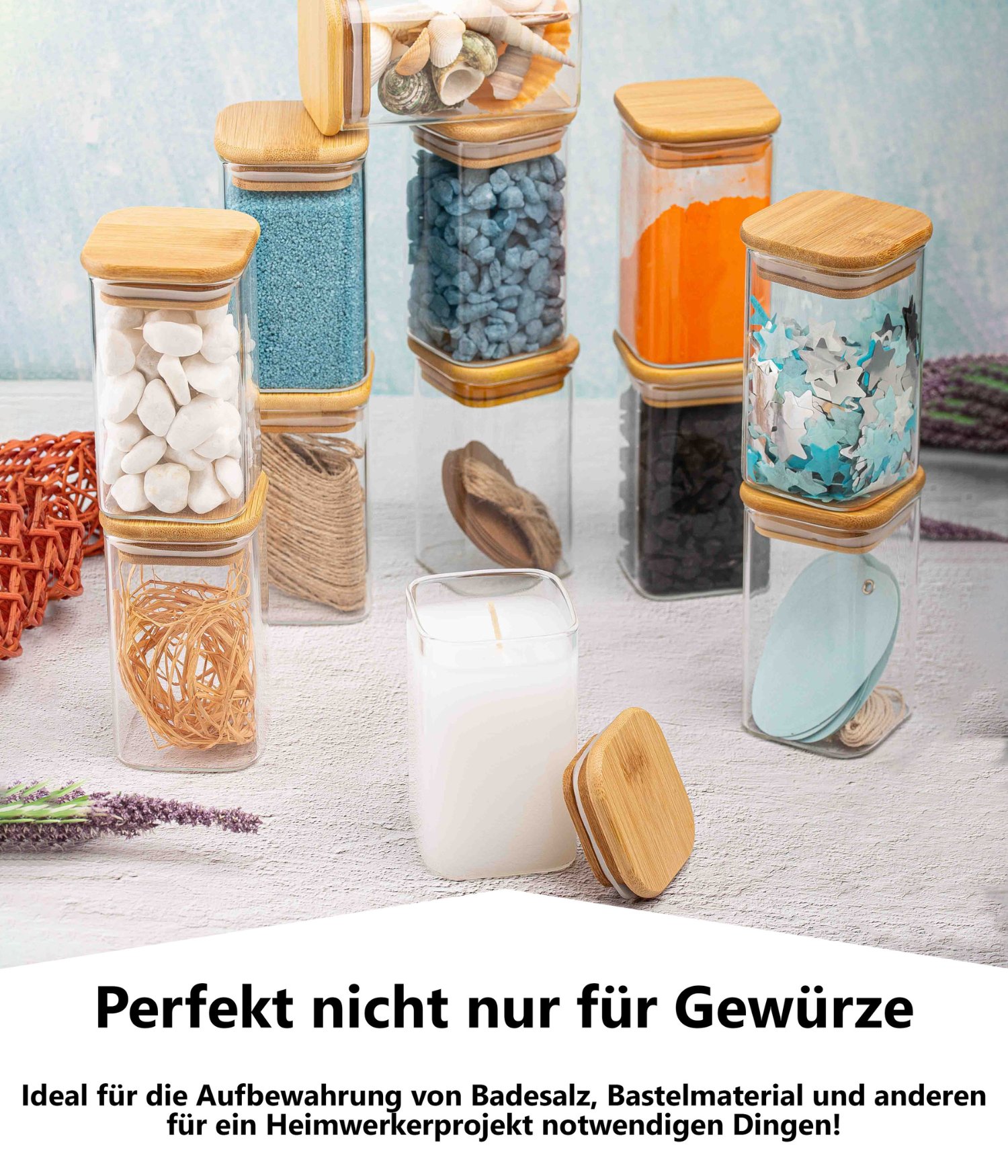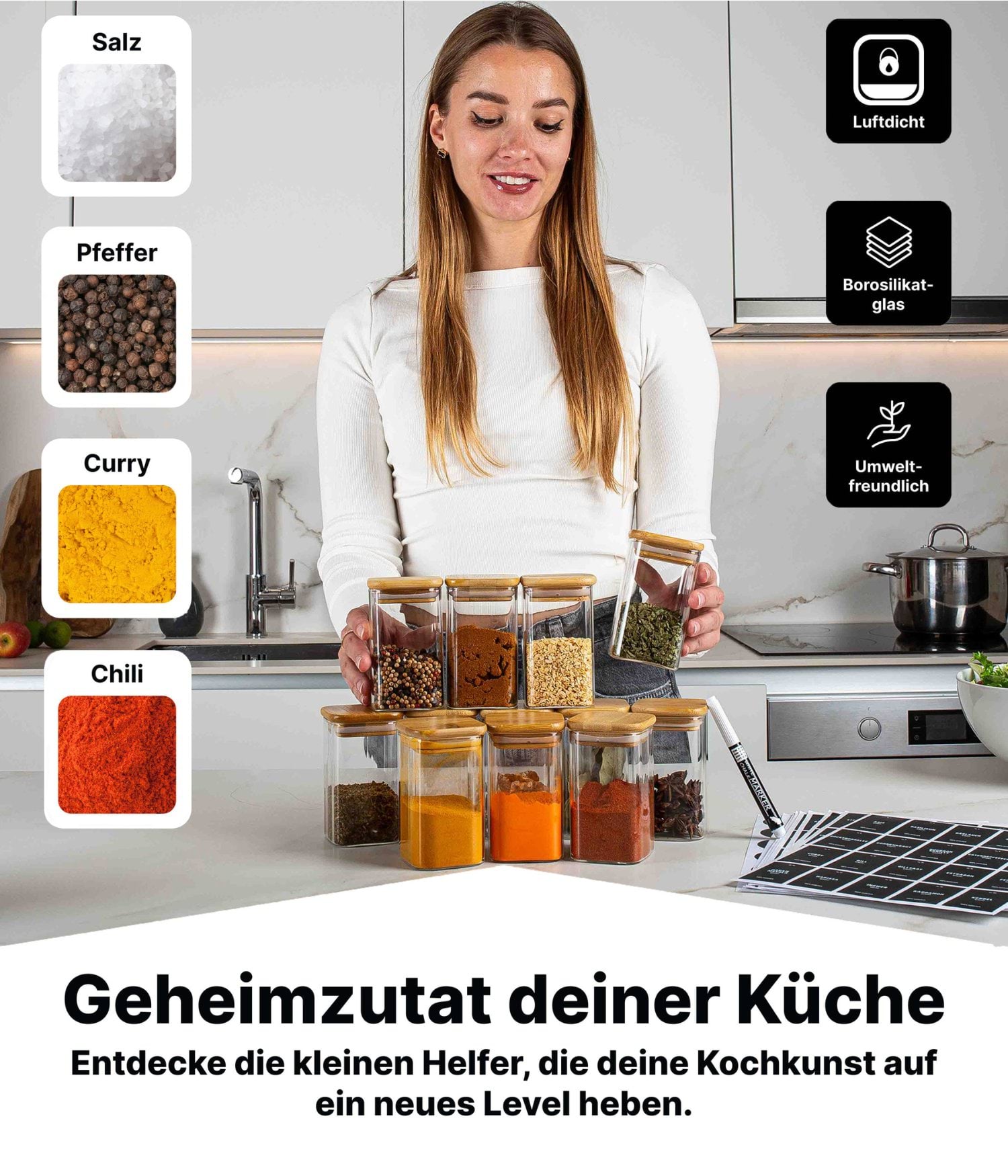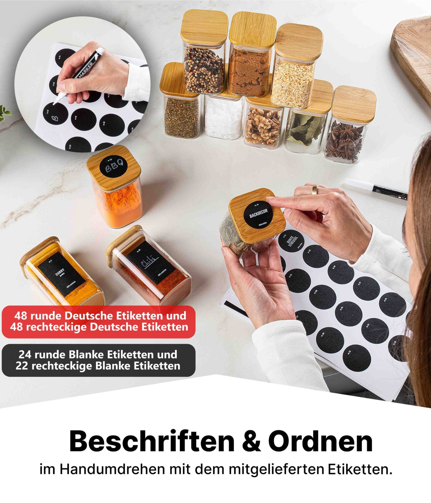 Deco haus Gewürzgläser Eckig mit Gewürzetiketten 12er Set – Gewürzdosen Set mit Holzdeckel Vorratsgläser Set für Deine Gewürze Aufbewahrung Gewürzbehälter behälter für gewürze – Gewürzgläser