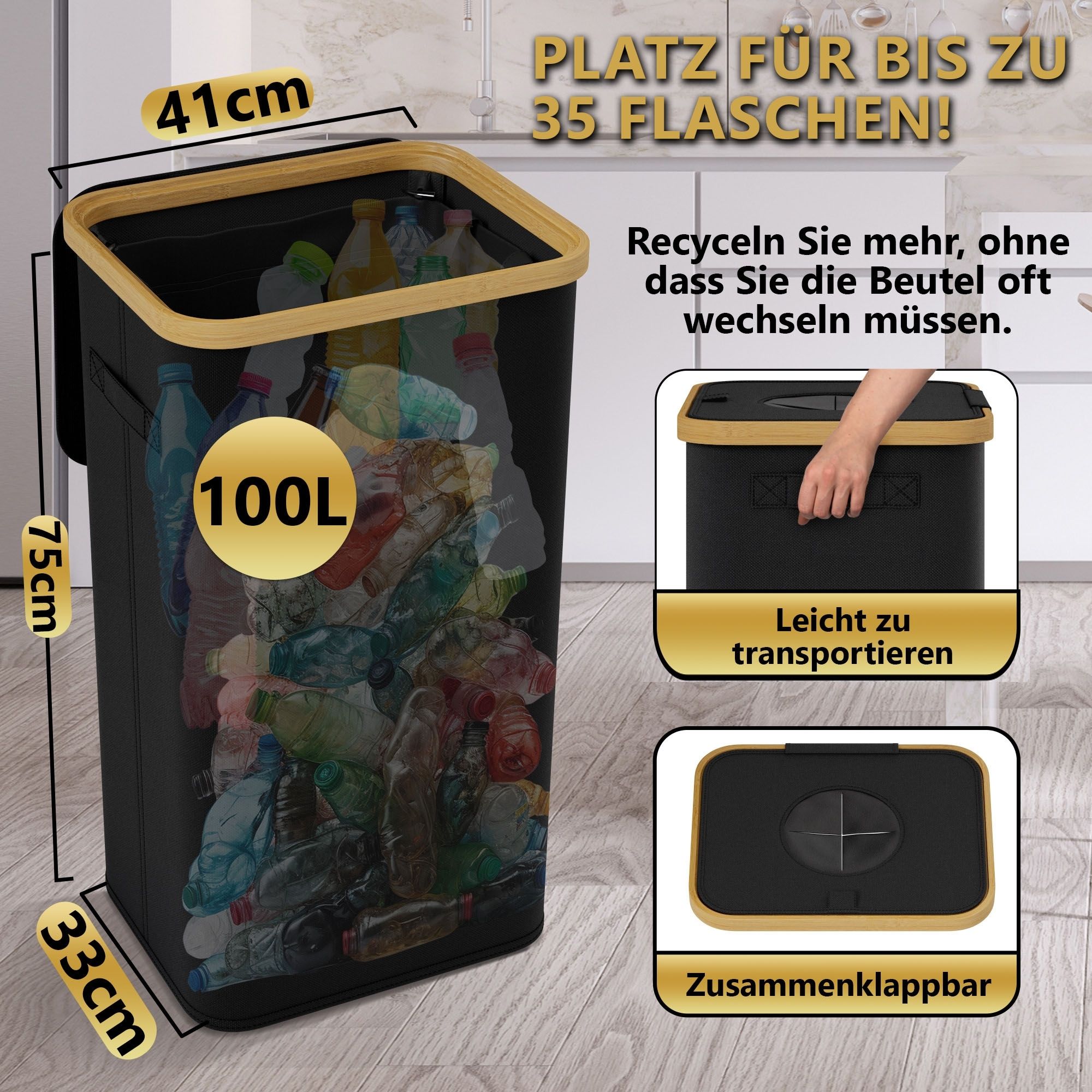 • GERÄUMIGE 100L KAPAZITÄT: Bietet Platz für große Mengen an Recyclingmaterialien, von Glas bis Kunststoff. Der Innenbeutel ermöglicht einfaches Heben, Reinigen und Organisieren.