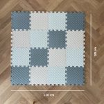 30 × 30 cm Schaumstoffplatten. Das Set besteht aus 16 Stück (und 2 zusätzliche lose Platten) Die Gesamtgröße des Teppichs ist 2,5 Quadratmeter und deckt. Er kann in verschiedenen Räumen und sogar im Freien verwendet werden.