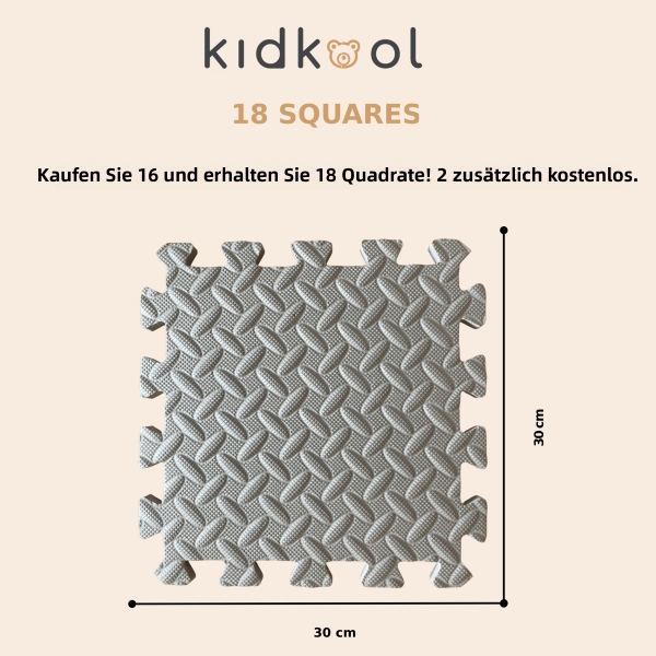 30 × 30 cm Schaumstoffplatten. Das Set besteht aus 16 Stück (und 2 zusätzliche lose Platten) Die Gesamtgröße des Teppichs ist 2,5 Quadratmeter und deckt. Er kann in verschiedenen Räumen und sogar im Freien verwendet werden.