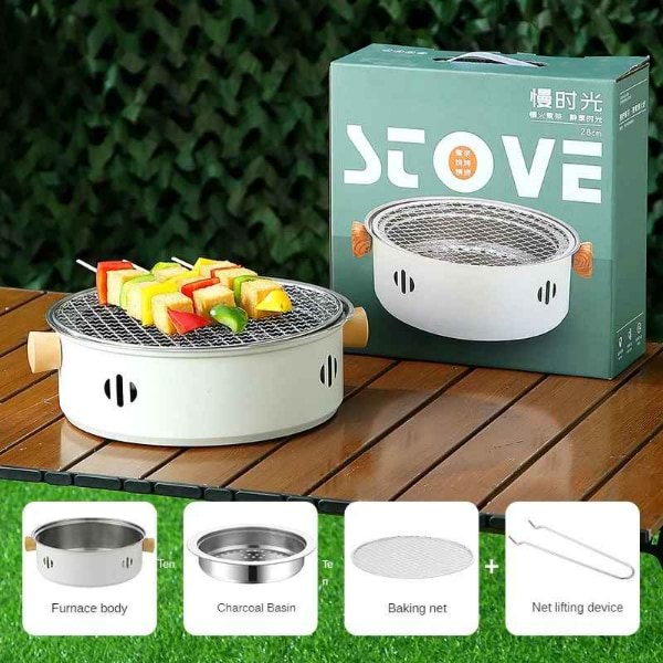 Der tragbare Holzkohlegrill verfügt über einen Griff aus Massivholz, einen rutschfesten Boden und erfordert kein Werkzeug für einen einfachen Aufbau.