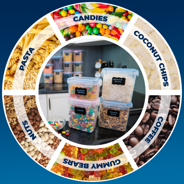Unser Set ist ideal für Snacks wie Bonbons, Müsli, Nüsse und Kekse, Grundnahrungsmittel wie Mehl und Frühstücksdinge wie Kaffeebohnen. Bewahren Sie Ihre Lebensmittel in diesen durchsichtigen Behältern auf, damit Sie sie aufbewahren und organisieren sowie jederzeit leicht darauf zugreifen können. Ab jetzt brauchen Sie sich nicht mehr zu merken, wo was steht!